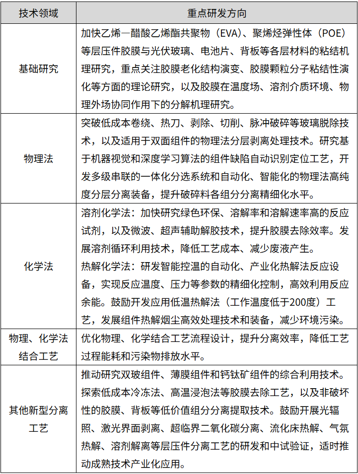 (二)突破高效分离工艺。开展光伏组件胶膜粘结机理研究,丰富完善胶膜低成本解离技术理论体系。加快研发晶硅单玻、双玻等组件的物理法、化学法、结合工艺及新型分离工艺,攻克光伏组件部件与胶膜的绿色、高效分离技术,鼓励开发非破坏性拆解技术,探索完整玻璃等材料获取路径。详见附件《高效分离工艺重点研发方向》。(工业和信息化部、生态环境部按职责分工负责)